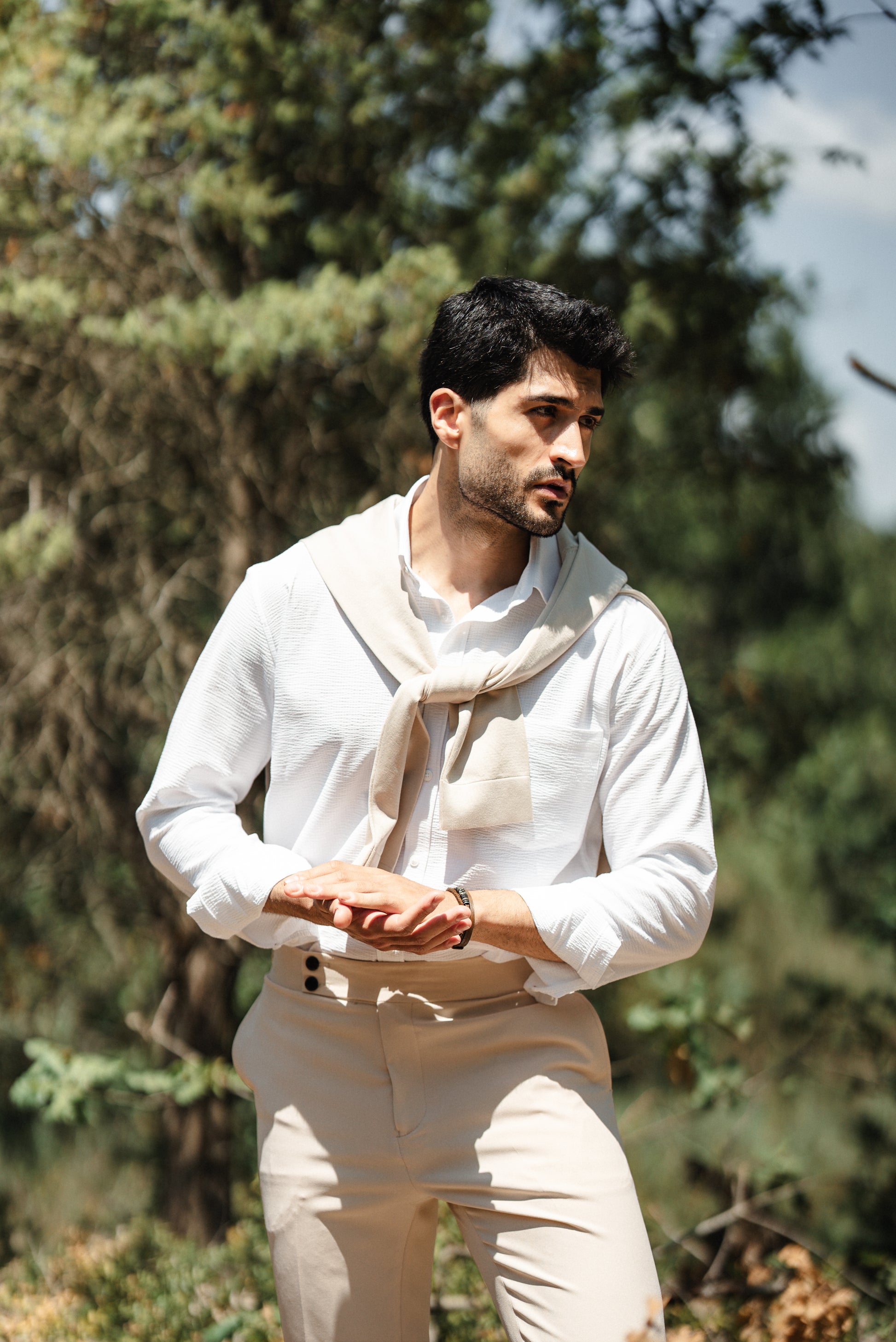 The versatile beige tone pairs perfectly with both casual and semi-formal looks, while the slim-fit design ensures a polished appearance. Perfect for beachside dinners, casual office wear, or relaxed outings.
