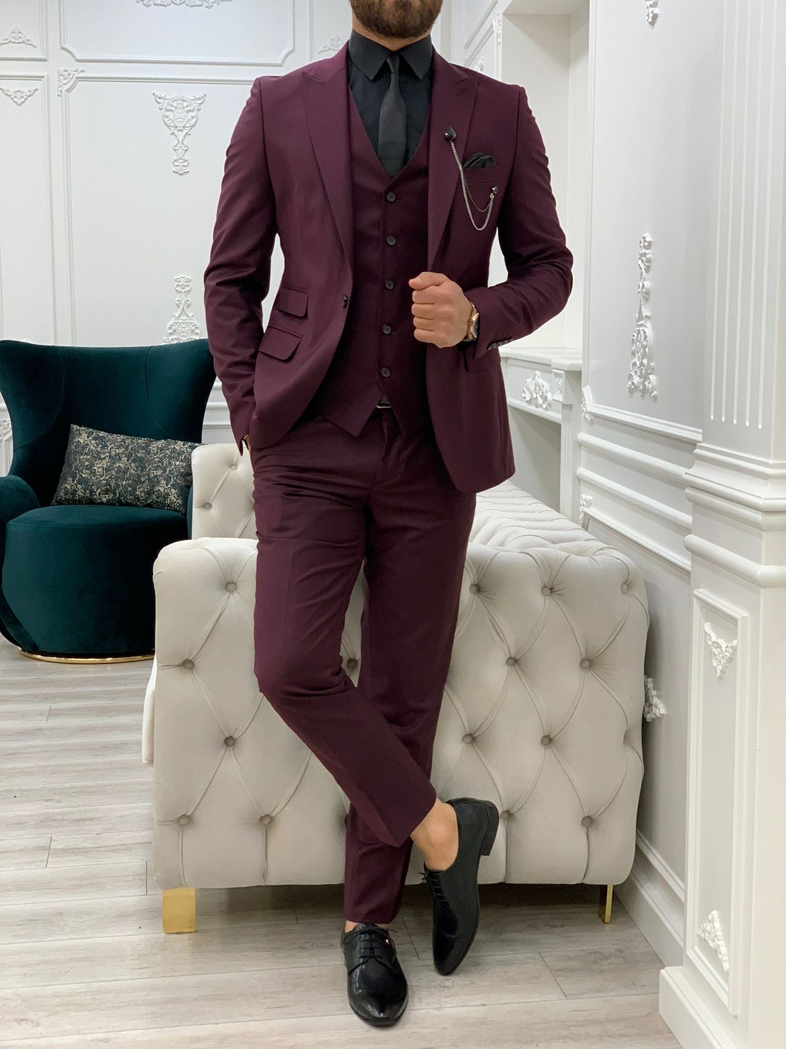 The Lance Burgundy Slim Fit Suit epitomises sophistication and versatility, making it an ideal choice for business meetings, weddings, and special events. Crafted from a blend of 65% polyester, 32% viscose, and 3% Lycra, this modern men’s suit provides comfort and style without sacrificing quality. The single-button jacket and double slits ensure a tailored silhouette, while the included vest and pants elevate your ensemble to three-piece elegance. Complete your look with the pocket square, chain, and neck tie, making it a perfect groom's suit or a refined option for any party.