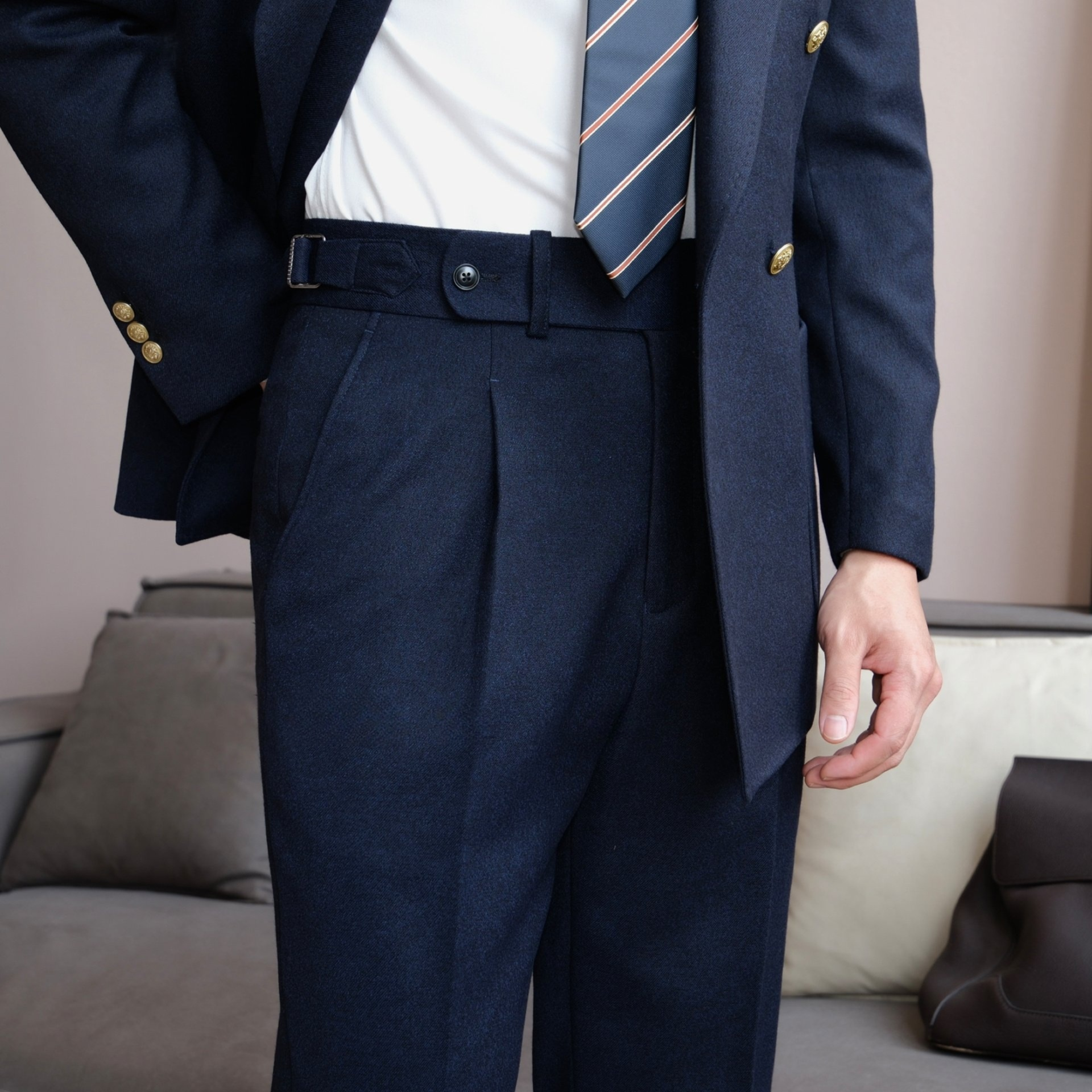 This men's double-breasted wrap suit with gold buttons delivers sophisticated elegance with a modern edge. The distinctive gold button detailing and wrap-style design create a refined statement piece perfect for formal events, business occasions, and special celebrations.