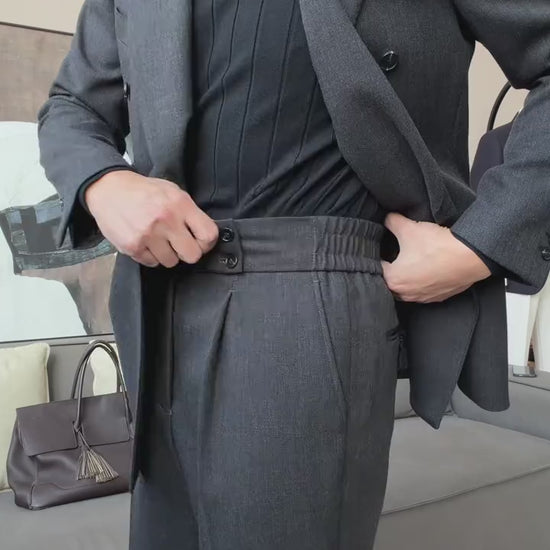 This men's six-button double-breasted suit features refined tailoring with peak lapels for a sophisticated, commanding presence. Perfect for formal occasions and business settings.