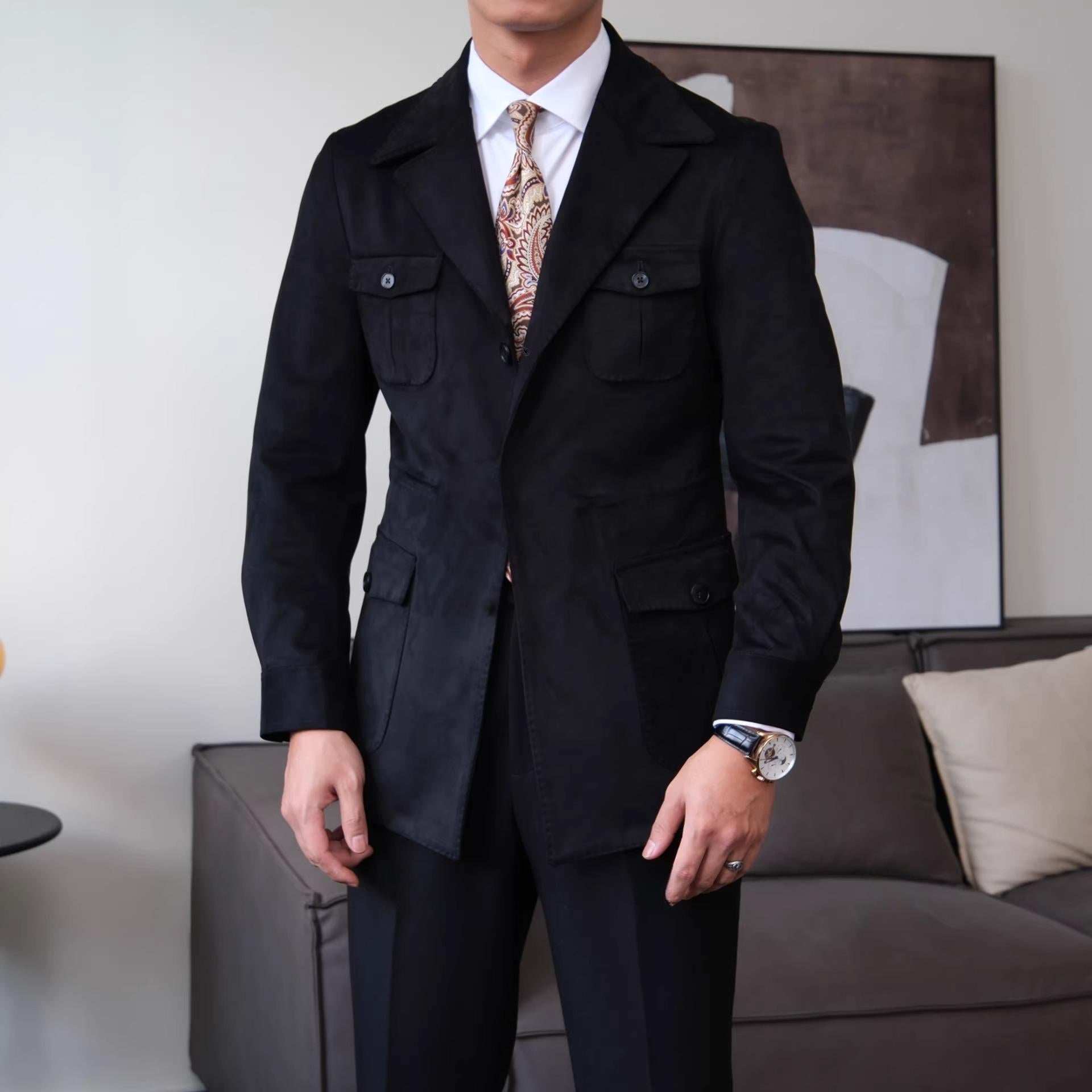his men's suede safari jacket combines adventure-inspired design with luxurious suede fabric. Featuring a classic safari silhouette and functional details, this jacket delivers refined style for the modern gentleman. Available in brown, black and green.