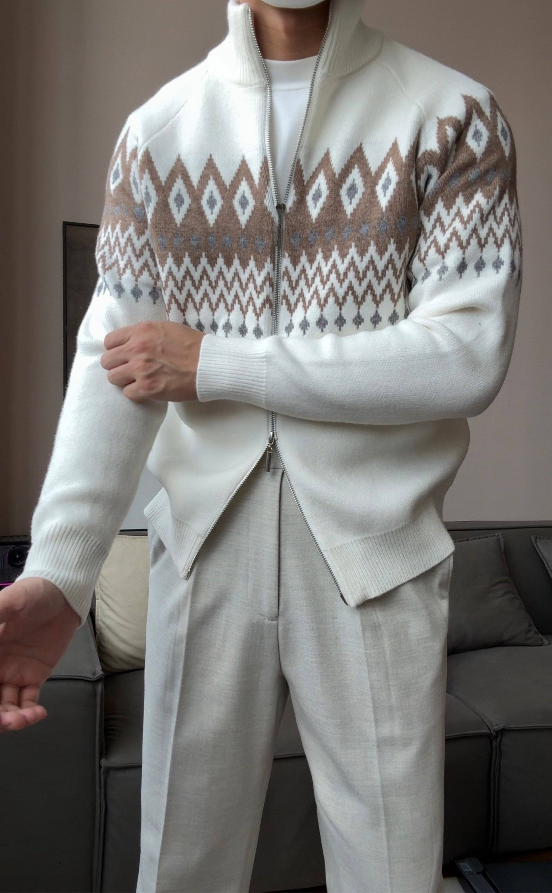 This men's thick zip-up knit cardigan brings refined warmth to cold-weather dressing. The full-zip closure and textured knit construction deliver both style and comfort, making it perfect for layering during winter months. Available in beige and navy blue.