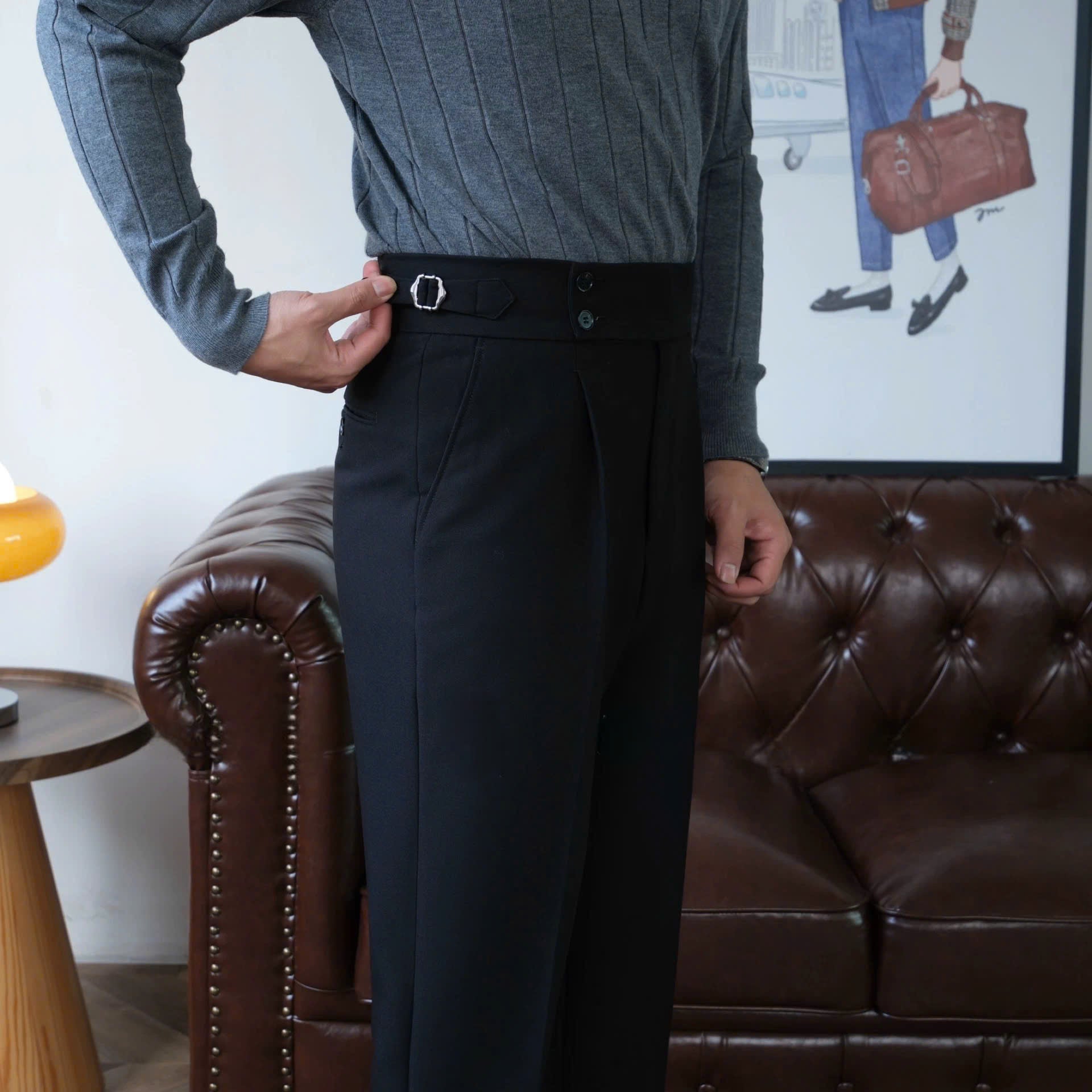 A high-rise profile, deep double pleats, and a gently tapered leg create an elongated, elegant line. The silhouette transitions seamlessly from formal ensembles to smart-casual outfits, maintaining a polished presence in every setting.